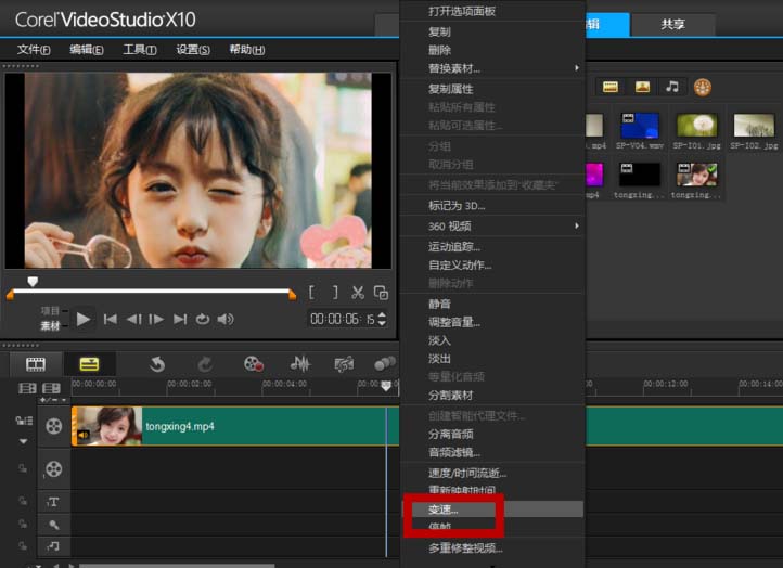 2、在選中視頻的狀態下,右擊鼠標,然后選擇變速。