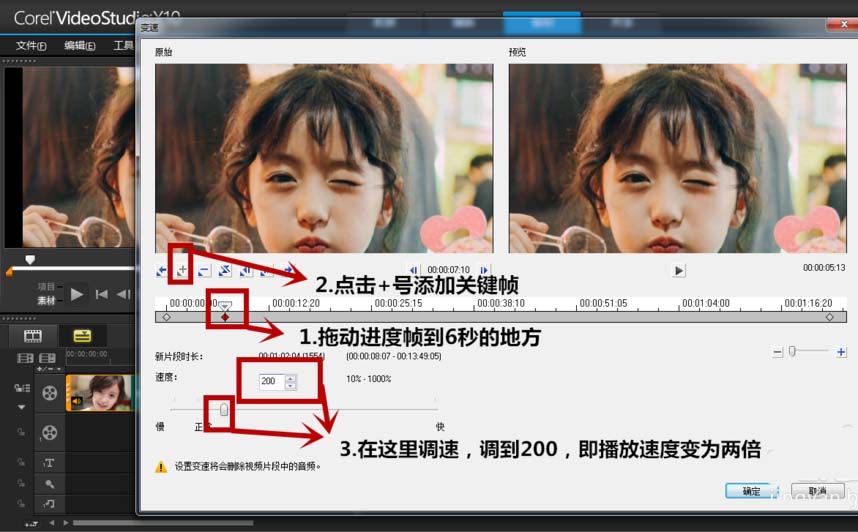 3、選擇變速之后,會出現下面的畫面,如果我們需要在視頻0~6秒的地方讓視頻播放速度逐漸變為兩倍,那就拖動進度幀到6秒的地方,點擊+號添加一個關鍵幀,在調速的地方把速度調為200,然后點擊確定