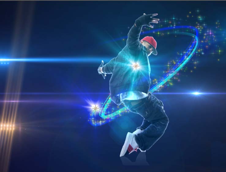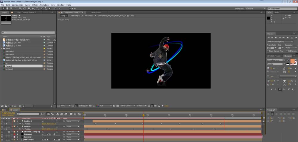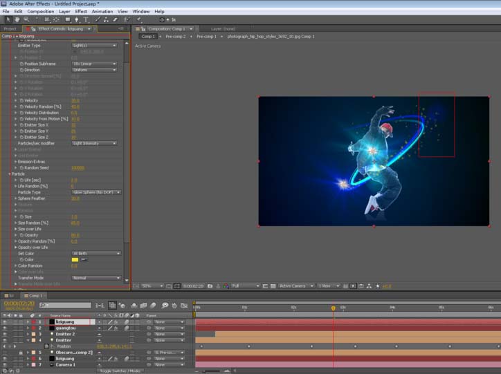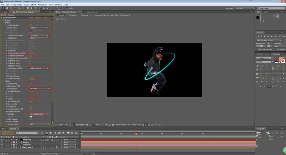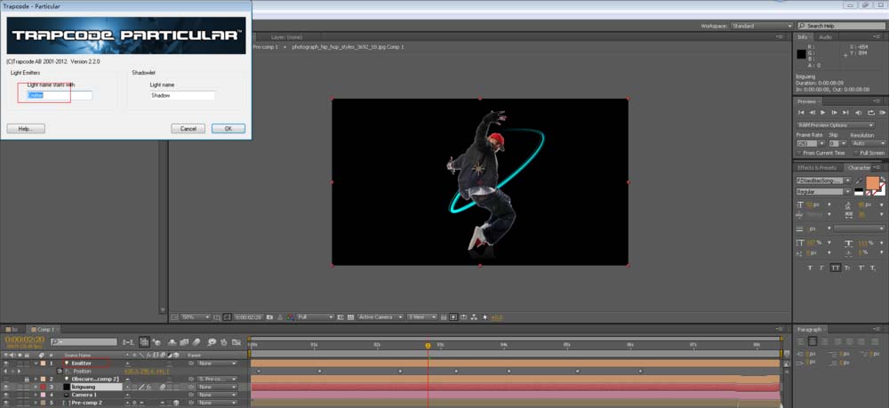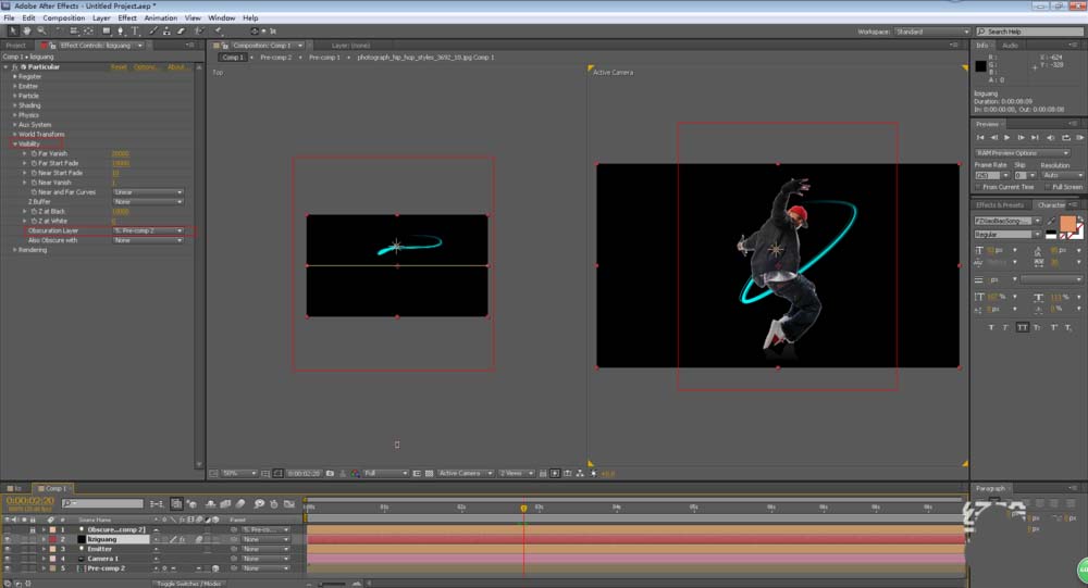 5、如上圖,你可以看到光線是在人的身上穿梭的,這樣太假了,我們可以利用par粒子里的遮擋關(guān)系制作出來很好的效果。