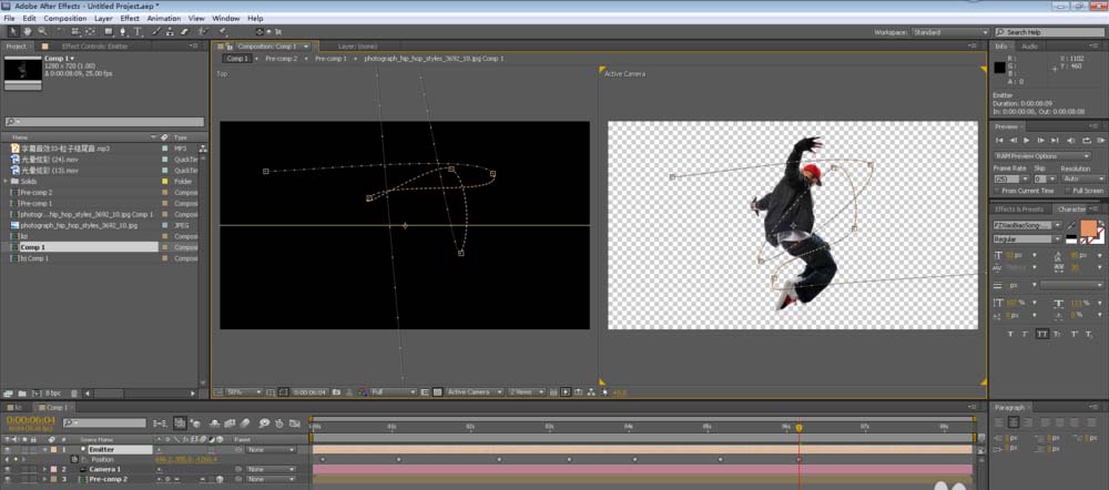 3、接下來,新建點(diǎn)光源,然后對(duì)點(diǎn)光源的位置上做位移動(dòng)畫,使其能對(duì)人物纏繞。可以調(diào)整到兩個(gè)視圖,仔細(xì)的調(diào)整,調(diào)整出空間的感覺。最后光線出去的時(shí)候可以對(duì)著攝像機(jī)沖過去,這樣可以有視覺沖擊的感覺。