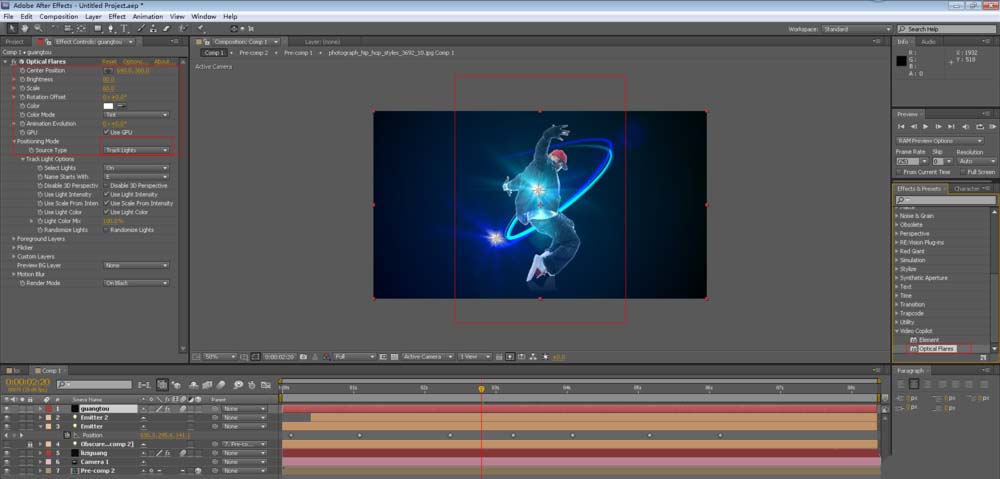 7、然后,新建一個(gè)固態(tài)層,將optical flare光效插件加載上,然后選擇自己喜歡的燈光,調(diào)整具體參數(shù),使燈光跟隨在光線的頭部,這樣看起來更好看。