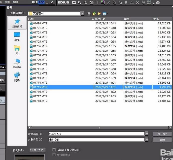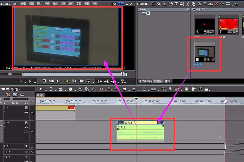 3、在EDIUS的素材庫中,導入我們需要裁剪的視頻。導入的視頻素材拖入到時間線上。