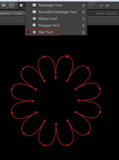 6、新建一個(gè)Solid,這里選擇五角星工具,在固態(tài)層上畫出一個(gè)五角星,這時(shí)注意鼠標(biāo)左鍵按住不放,點(diǎn)按↑↓鍵改變五角形的角數(shù),← →鍵改變五角星的邊弧度。經(jīng)過細(xì)細(xì)調(diào)節(jié),一朵花就畫出來了。