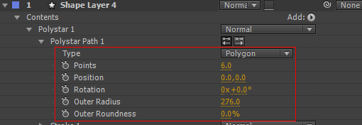 3、依然是進(jìn)入shape層的屬性層層展開,如圖,找到Polystar Path1,對(duì)下一層級(jí)的屬性進(jìn)行設(shè)置,你會(huì)發(fā)現(xiàn)正五邊形會(huì)發(fā)生無窮盡的變化。各種復(fù)雜的shape就出現(xiàn)了。其中Points代表多邊形的邊數(shù)(也就是頂點(diǎn)數(shù)),Outer Roundness決定邊的弧度,有正弧度和負(fù)弧度,而最上面的Type可以選擇是Polygon(多邊形)還是Star(星形)。