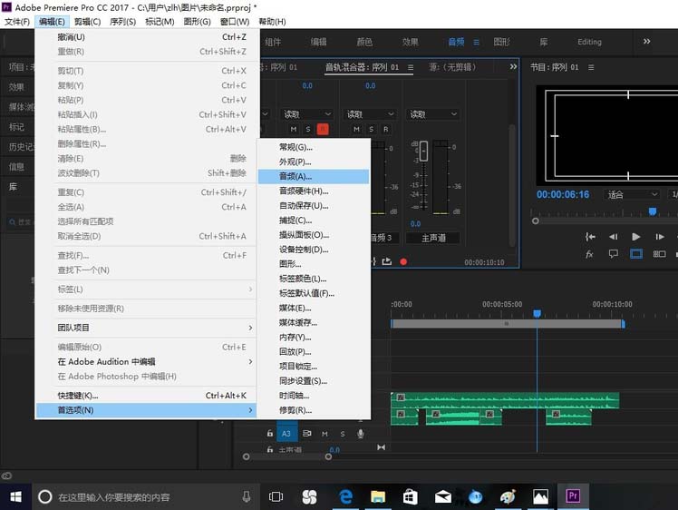 6、另外在后期配音過程中如果有背景音樂及回音,那到編輯欄下的“首選項”里找到“音頻”,然后將“時間軸錄制期間靜音輸入”前打上勾。