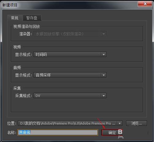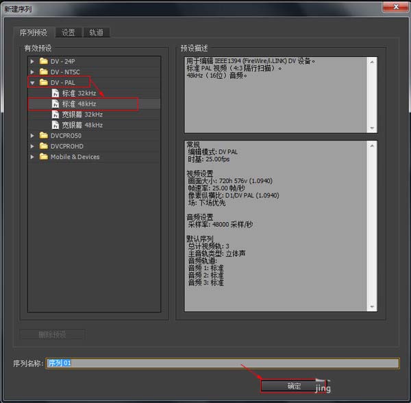1、運行軟件,新建一個項目。新建項目的對話框中,點擊“確定”。 彈出新建序列窗口,一般我們選擇的有效預設是DV-PAL-標準 48kHz,然后看到右邊的預設描述中視頻的畫面大小是720h 576v,其實有效預設簡單的理解為視頻的畫面的大小,序列名稱也可進行命名。下一步點擊確定。