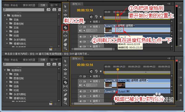 5、如果不想要整段視頻都運用這個效果的話,可以通過分割視頻來給指定的視頻片段添加效果。首先把進度條拖到要分割視頻的位置上,接著在工具欄里找到剃刀工具,接著用剃刀工具在進度條紅色線上點一下,這樣視頻就被分割成了兩部分了。接著再把殘像特效拖拽到要添加這個效果的視頻即可。