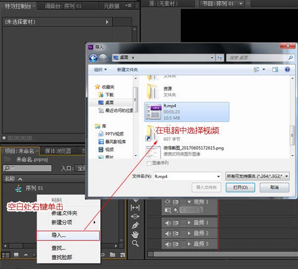 2、來到軟件主界面中,在項目:未命名的框里空白處,點擊鼠標右鍵出出現小框選項,點擊“導入”即可。在彈出來的窗口里選擇需要視頻,并點“打開”。