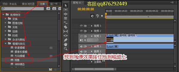 4、然后在“效果”面板里找到“視頻特效”-“模糊與銳化”-“殘像”,按住殘像效果按住并拖拽到視頻1軌道的視頻上去。只要把特效拖拽到視頻中,就一整個視頻都會應用了這個效果。
