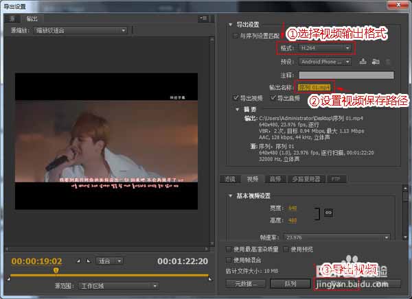 7、在導出設置界面中,在格式中選擇視頻導出的格式,有AVI,、F4V、H.264、MOV等其他的格式,其中H.264就是MP4格式。輸出名稱中點擊黃色字體會彈出窗口可以更改保存目錄和名稱。其他的設置都不用進行設置,保持默認就行。下一步“導出”。