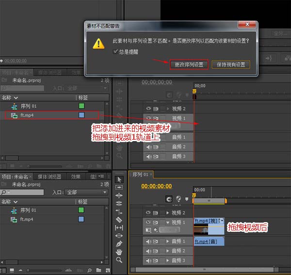 3、接著把添加進來的視頻素材按住往右邊的時間線里拖拽,拖拽到視頻1軌道中,然后就會彈出一個提示框,選擇“更改序列設置”就好。選擇好以后視頻就顯示在視頻1軌中了。