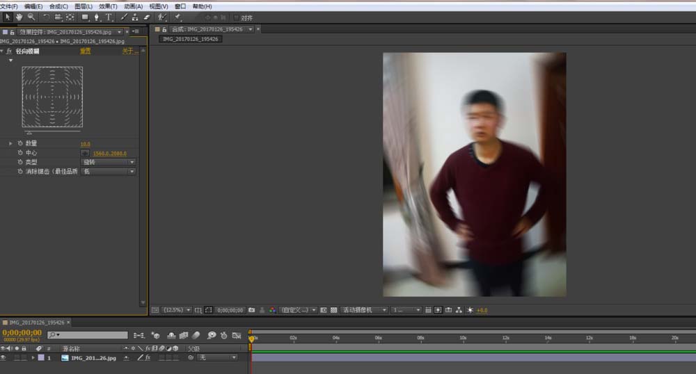 2、將JPEG圖片文件拖入右邊的編輯面版,點擊菜單欄中的效果-模糊和銳化-徑向模糊,得到的效果如圖