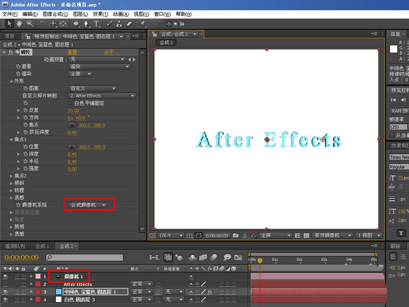 9、接著在合成窗口,按CTRL+SHIFT+ALT+C添加一個攝像機,并將藍色固態層效果上的攝像機系統設置為合成攝像機,如下圖: