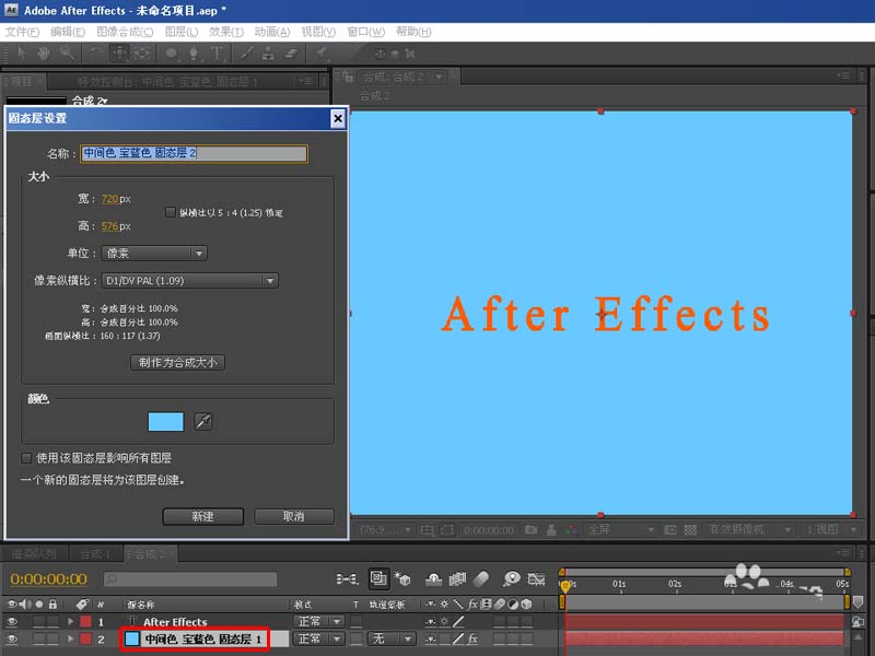 3、再來按CTRL+Y新建一個固態層,固態層顏色影響后面3D文字顏色,所以按自己實際需要設置,如下圖:
