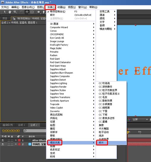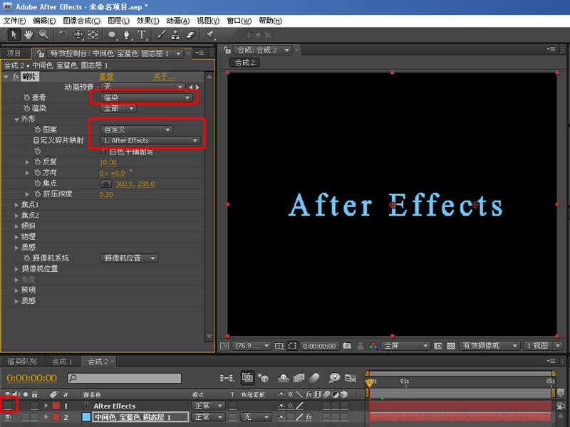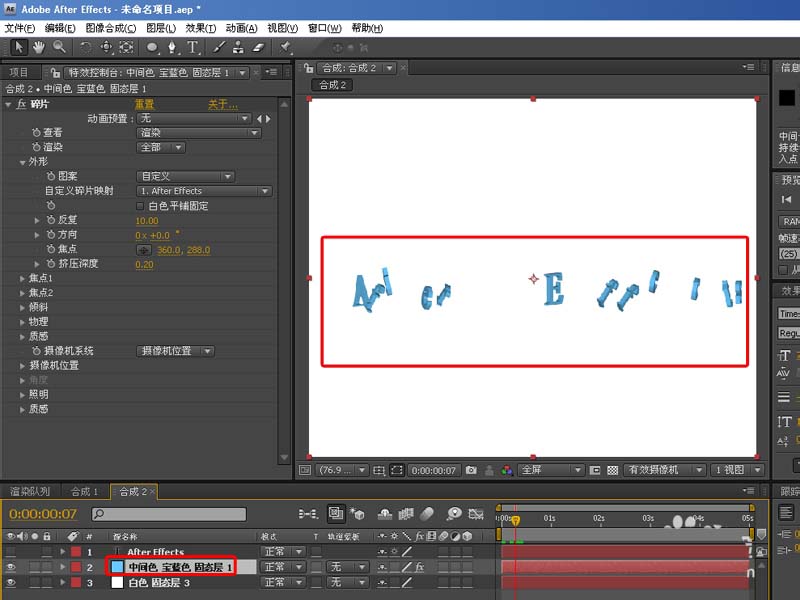 4、接著為固態層添加效果-模擬仿真-碎片,設置查看模式為渲染,圖案為自定義,自定義碎片映射為文字層,并把文字層的眼睛關閉,如下圖: