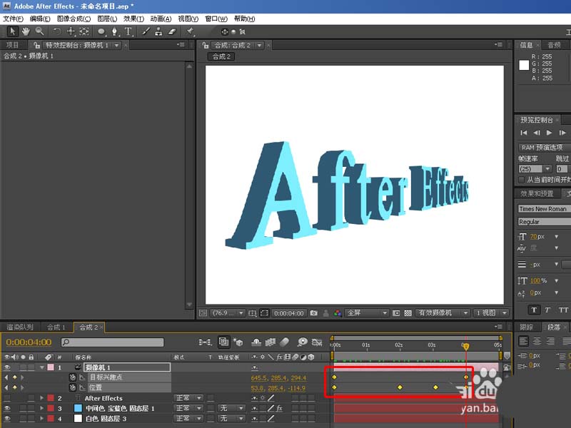 10、最后給攝像機添加運動關鍵幀,按P彈出位置,再按SHIFT+A彈出目標興趣點設置運動關鍵幀(不懂怎么設置的,請看我 After Effects CS4小提示[3]攝像機的運用),如下圖: