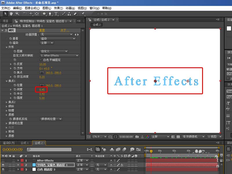 6、拉動時間時間線你會發現文字會有象掉下的效果,但是要做的是3D文字,不需要此效果,OK,點擊回到藍色固態層,點開焦點,將深度設置為0.45,可以看到文字不再有下落效果,如下圖:
