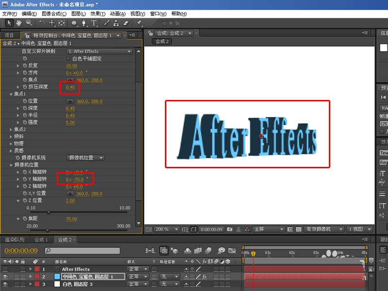 7、再來點開攝像機位置將Y軸設置為-70,觀看文字厚度,并設置擠壓深度為0.4,將文字厚度加大,如下圖: