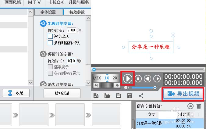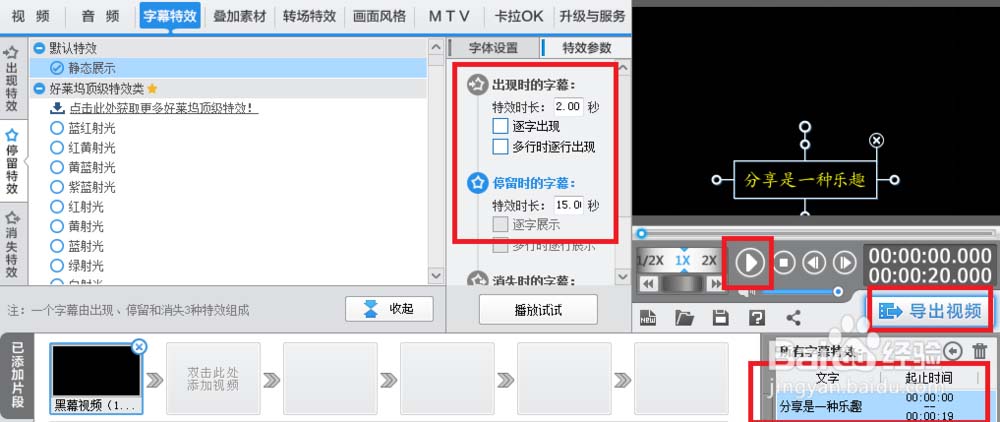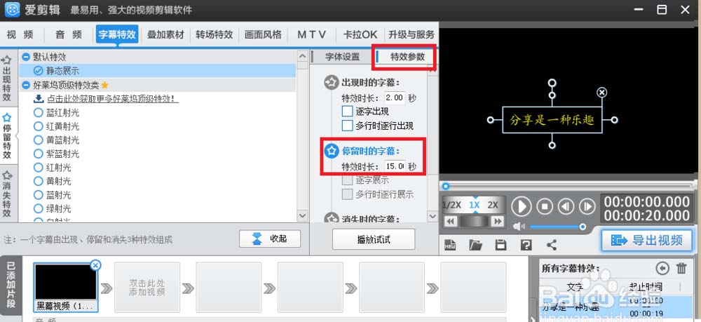 4、選擇特效參數(shù),設(shè)置--停留時(shí)的字幕--停留時(shí)長。如圖: