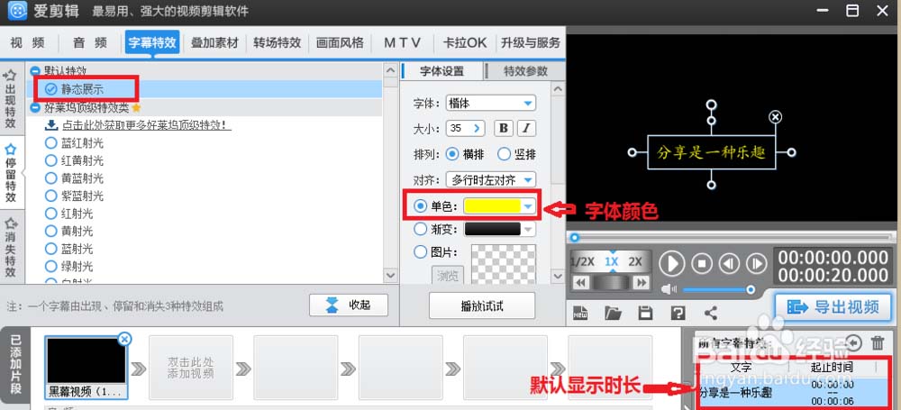 3、根據(jù)喜好設(shè)置字體顏色,字幕顯示區(qū)域,默認(rèn)顯示時(shí)長為6秒。如圖: