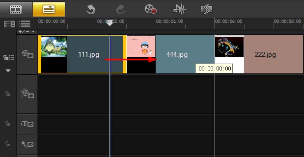 5、如果要移動轉場怎么辦呢?單擊鼠標左鍵并拖拽至第二張與第三張照片之間釋放鼠標左鍵,即可移動轉場效果;