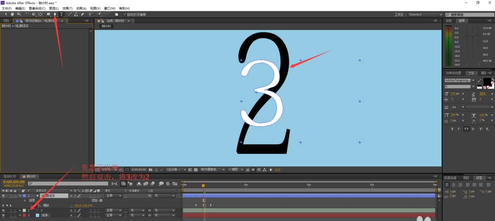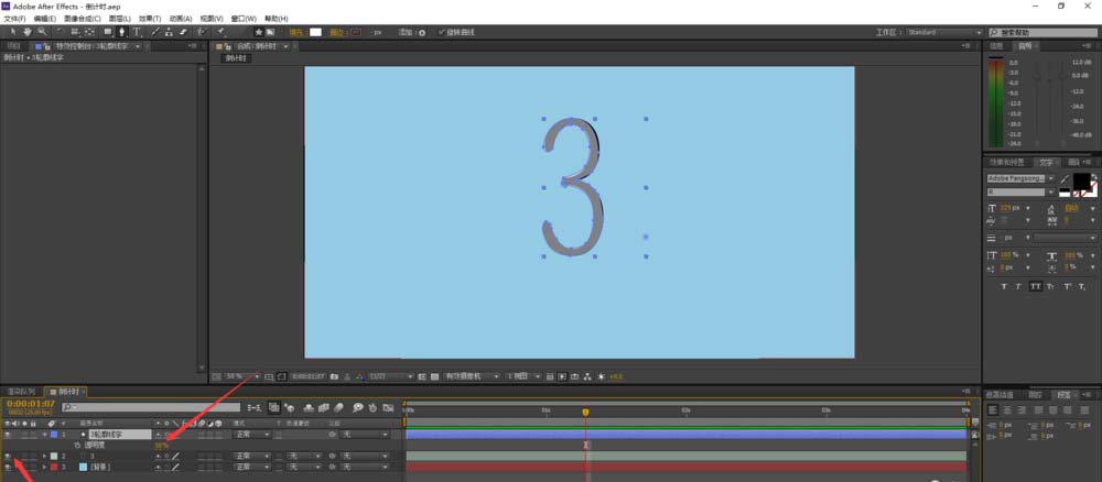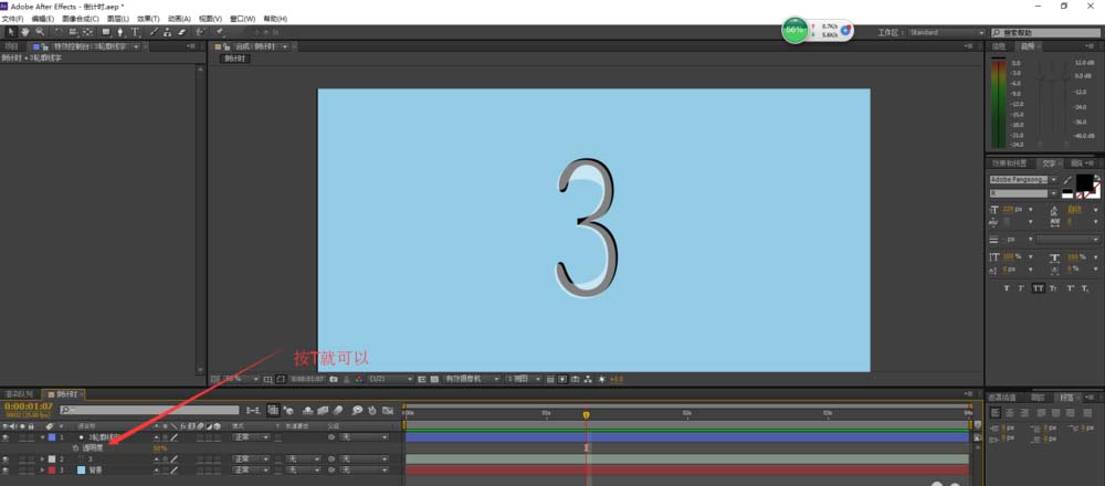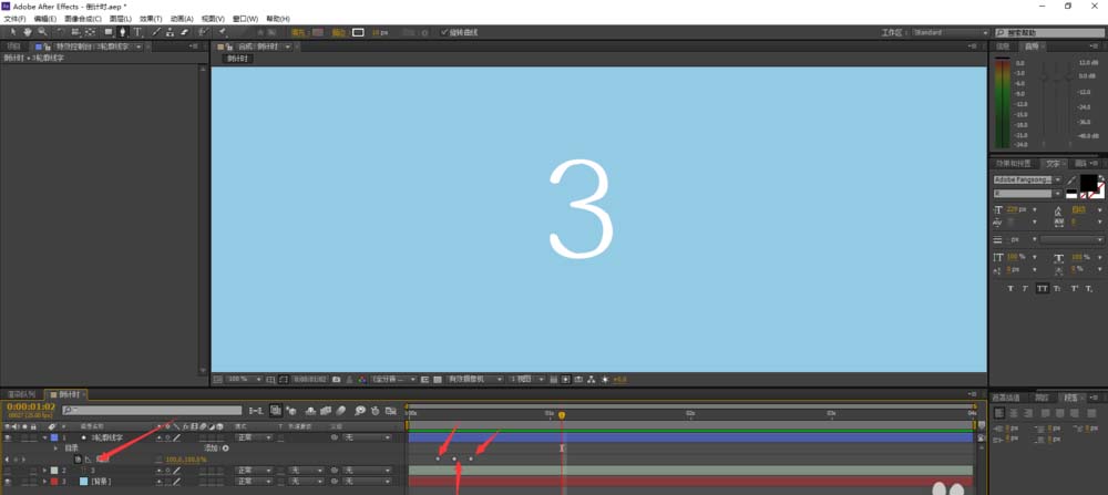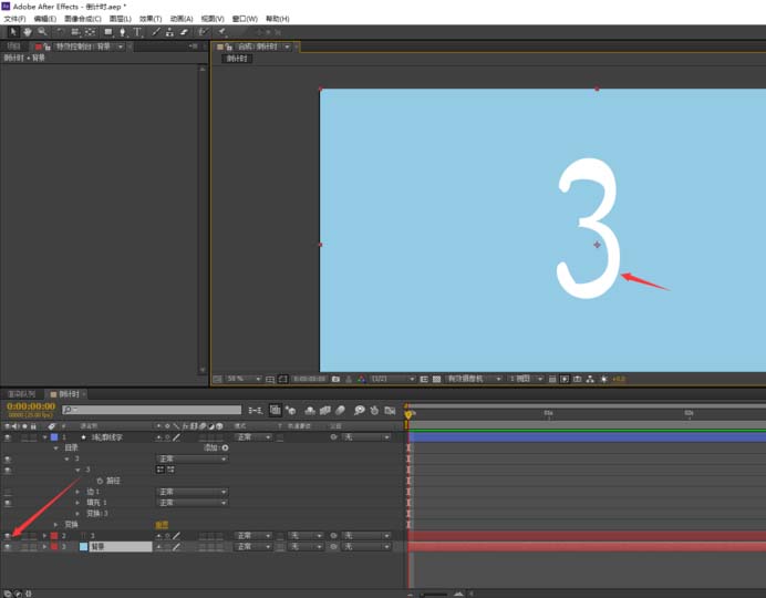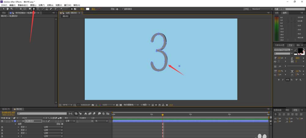 3、設(shè)定這個視頻從3開始倒數(shù),所以我們先用文字工具添加一個“3”然后在按住Y鍵來改變它的中心,方便我們將它的大小調(diào)節(jié)至合適的位置。(如圖所示)