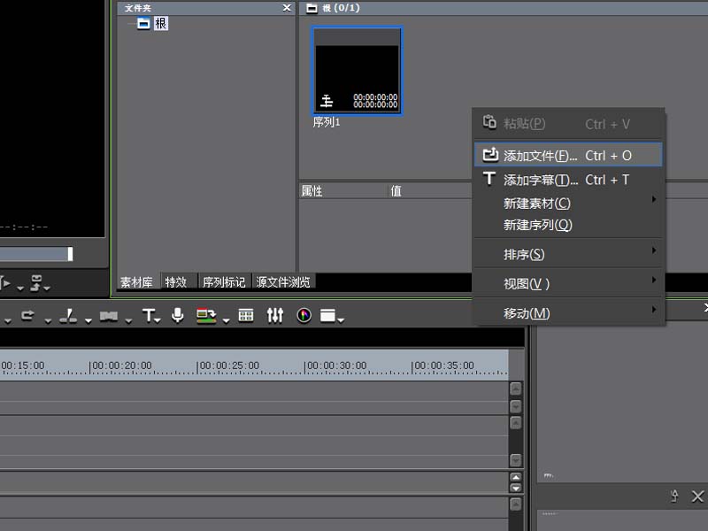 2、在素材庫中右鍵單擊,從下拉菜單中選擇添加文件選擇,在彈出的打開對話框中找到所需要的音頻和圖片,選中后點擊打開按鈕,將素材導入。