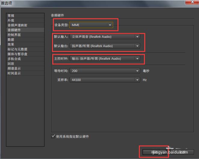 2、設備類型選擇MME,默認輸入和默認輸出都選擇電腦現在使用的聲卡,主控時鐘選擇聲卡的輸出通道,點確定