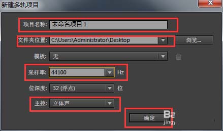 3、首先創建一個項目。點擊Au左上角的文件-新建-多軌合成項目,項目名稱可以自己取,文件夾位置放在一個自己容易找到的地方(我直接放桌面),采樣率選44100,主控選立體聲