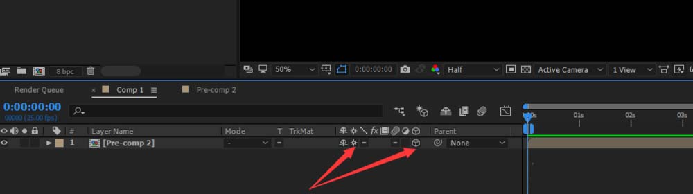 9、將所有的合成合并為一個預合成,并且打開小太陽標志和三維層開關。