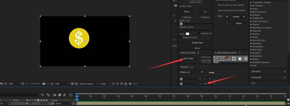 3、利用兩個插件將預合成的大小裁切一下并將中心點設置到中心。