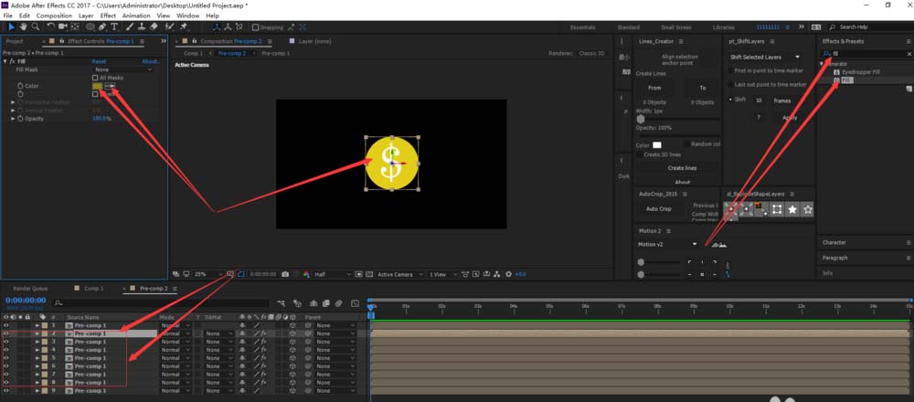 7、給第二到第八個合成添加填充效果,填充比硬幣稍微中一點的顏色,目的是讓硬幣翻轉的時候有陰影的效果。