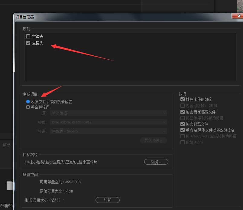 2、點擊源頭,就是你序列的名字,再次看下面點擊收集文件素材的選項,