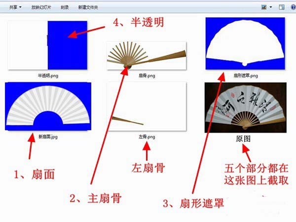 首先,要在百度圖片下載一幅高清折扇圖片,用PS軟件分解成好幾個png圖片,保存在同一個文件夾。如下圖: