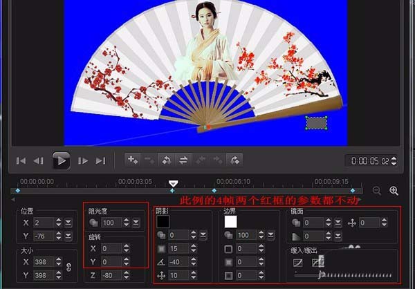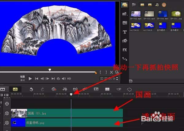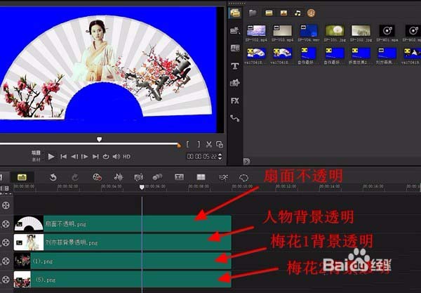 扇面如果不透明,就在覆疊軌3導(dǎo)入背景透明的花朵、人物等png圖片,調(diào)好位置。同樣抓拍快照。想制作多種扇面變換就如此操作。完成后默認大小是1024×576。(也可用PS制作扇面)