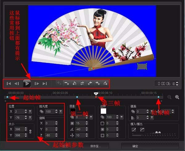 接著將鼠標在時間軸05.02秒處雙擊,添加第二幀,只改動Z為-80;然后在06.10處雙擊添加第三幀,參數(shù)和第二幀一樣,再轉(zhuǎn)到結(jié)束幀,將參數(shù)設(shè)成和起始幀一樣。點擊設(shè)置面板上播放,滿意了就點擊“確定”。