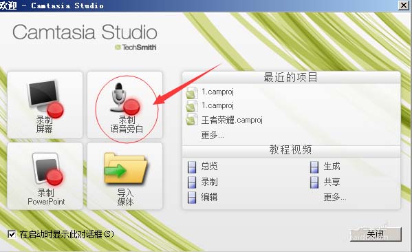 1、打開Camtasia Studio 6 ,默認會顯示一個對話框,請選擇“錄制語音旁白”,點擊確定。