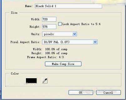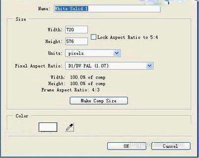 5、在彈出的新建固態層窗口中,設置大小與合成相同,點擊Make Comp Size即可,同時設置Color為白色。
