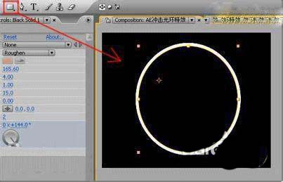 8、在彈出的新建固態層設置窗口中,設置大小與合成等同,點擊Make Comp Size便可,設置Color為黑色。然后按照步驟六所示,繪制出一個圓形遮罩,并如圖所示設置與下一個固態層的位置,形成一個白色圓環狀。