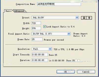3、在彈出的新建合成窗口中,Composition Name輸入為AE沖擊光環特效,Preset設置為PAL D1/DV,時間設置為8秒。