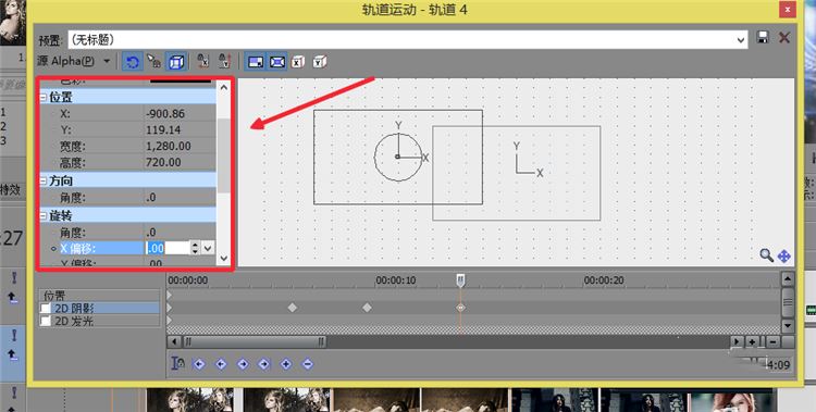5、當然為了運動的準確性,我們也可以通過左側編輯xy軸的數值來精確控制素材運動的路徑。