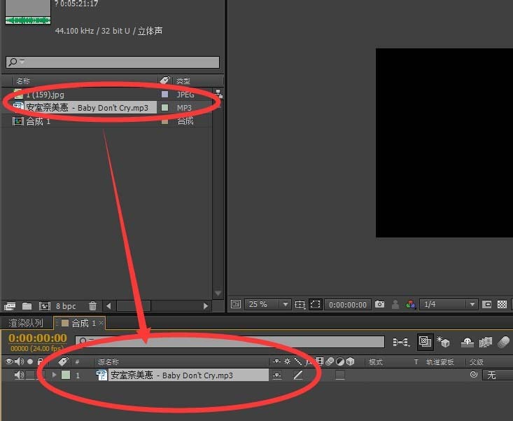 1、首先我們先登錄AE,添加所需要的音樂和背景圖片