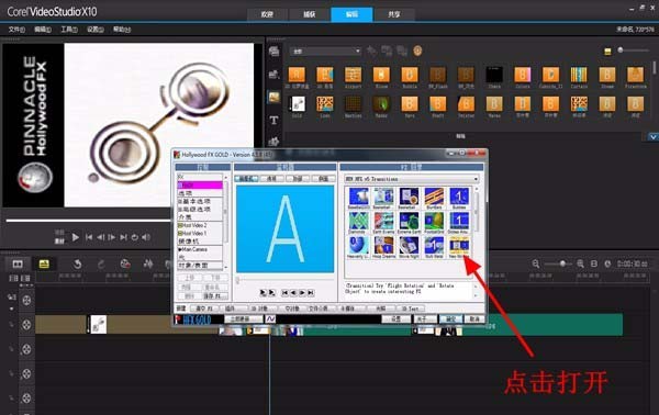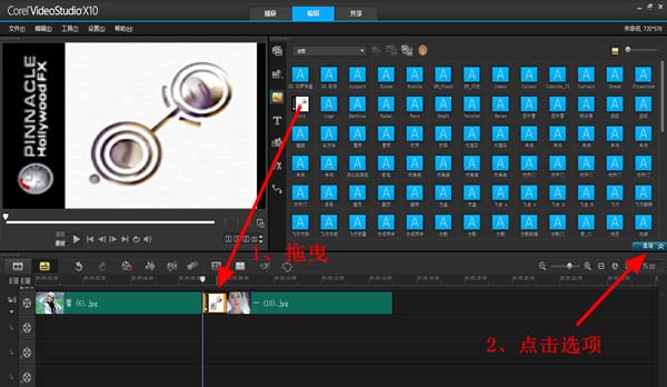 2、點(diǎn)擊”全部“,或在素材庫面板下面找到Hollywood FX ,找到后拖曳到兩圖片之間,點(diǎn)擊好萊塢轉(zhuǎn)場選定,然后點(diǎn)擊右邊的”選項“。