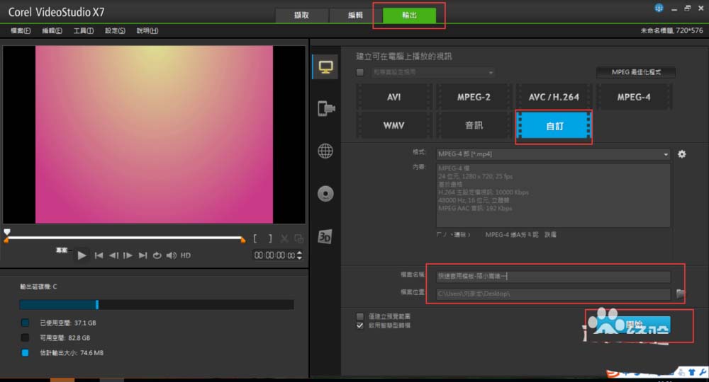 6、所有內容都替換和編輯好后,點輸出,設置下參數,把制作好的視頻生成。如圖: