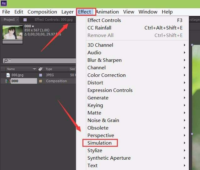 5、在上面的菜單里找到effect菜單,并在其子級菜單里找到simulation選項,如圖所示: