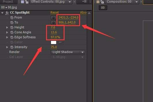 6、點擊effect菜單,在其內找到perspective選項,點擊perspective選項,在其下拉菜單那里找到CCspotlight選項,點擊該選項,其參數設置,如圖所示: