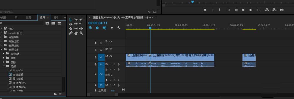 5、在效果里面找到視頻過渡,在過渡效果里面選擇第一個效果morphcut,拖到兩個素材中間