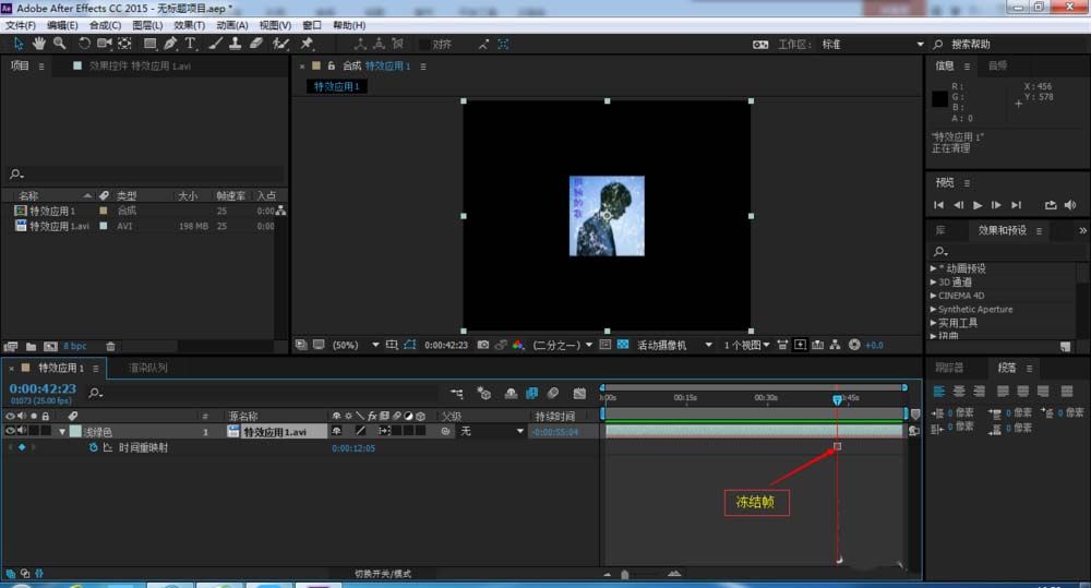 6、在時間控制里還有一個是“凍結幀”。你想截取視頻中的某個畫面,就可以使用這個功能。一旦啟動這個功能整個視頻就是一幅畫了,這樣你就可以截取你認為最美的一幅畫面。總結一點:視頻的快慢鏡頭與視頻時間長短有關,就是你想你做的慢鏡頭或者快鏡頭更加凸顯就得設置視頻的持續時間。