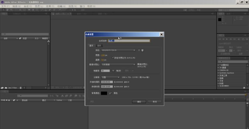 1、首先啟動After Effects軟件,敲擊鍵盤上的ctrl+N鍵新建一個合成組(你也可以使用鼠標右鍵單擊項目面板空白處,在彈出的菜單中選擇新建合成命令,同樣可以新建一個合成組),將預制制式選擇為PAL制式,合成持續時間設置為10秒鐘