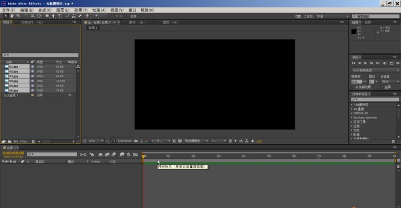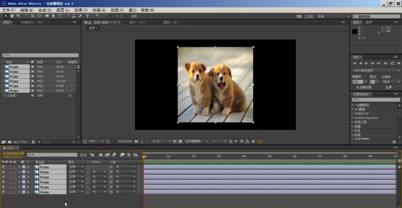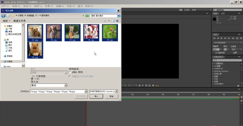 2、使用鼠標左鍵雙擊項目面板的空白處,在彈出的導入素材窗口中選擇要導入的素材(多選素材要按住鍵盤上的ctrl鍵不松手進行選擇,也可以使用鼠標左鍵框選素材),單擊導入按鈕將素材全部導入到After Effects項目面板,然后使用鼠標左鍵將素材全部選中不要松手拖動到時間線面板,依次排列順序